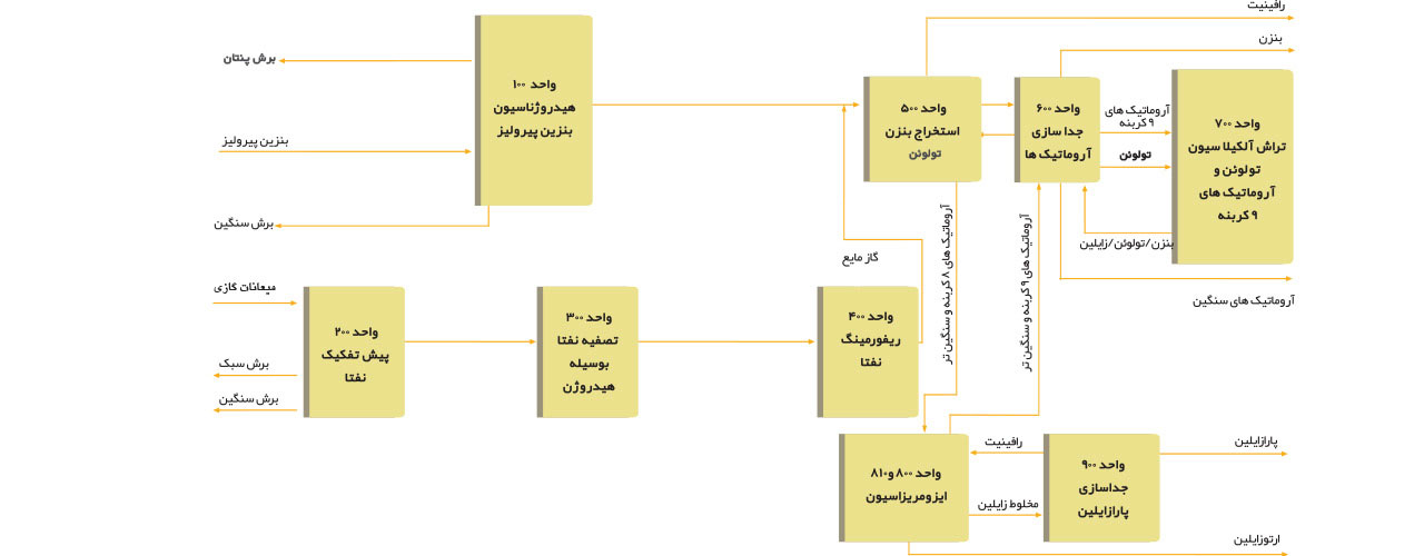- بنزن: تولید استایرن، دودسیلبنزن برای شویندها، سیکلو هگزان (برای تولید نایلون)، فنل و نیتروبنزن (برای تولید آنیلین) و حلالها