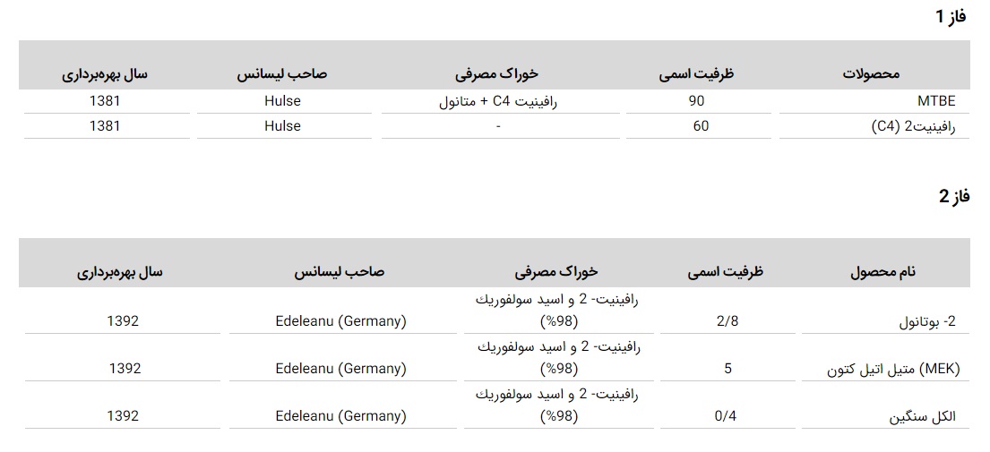 تولیدات اصلی (هزار تن در سال):