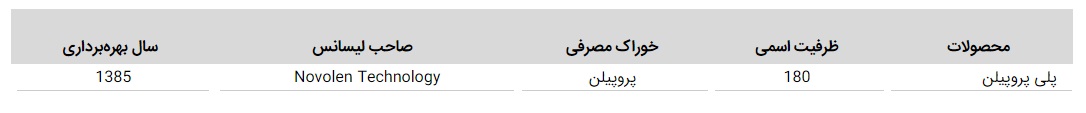 ظرفیت اسمی(KTY): 180 محل مجتمع: منطقه ویژه اقتصادی پتروشیمی مساحت: 12.3 هکتار سال تأسیس: 1381 مالکیت: بخش خصوصی 100 درصد گواهینامه های استاندارد دریافتی: ISO 9001, ISO 14001, OHSAS 18001, ISO 10002