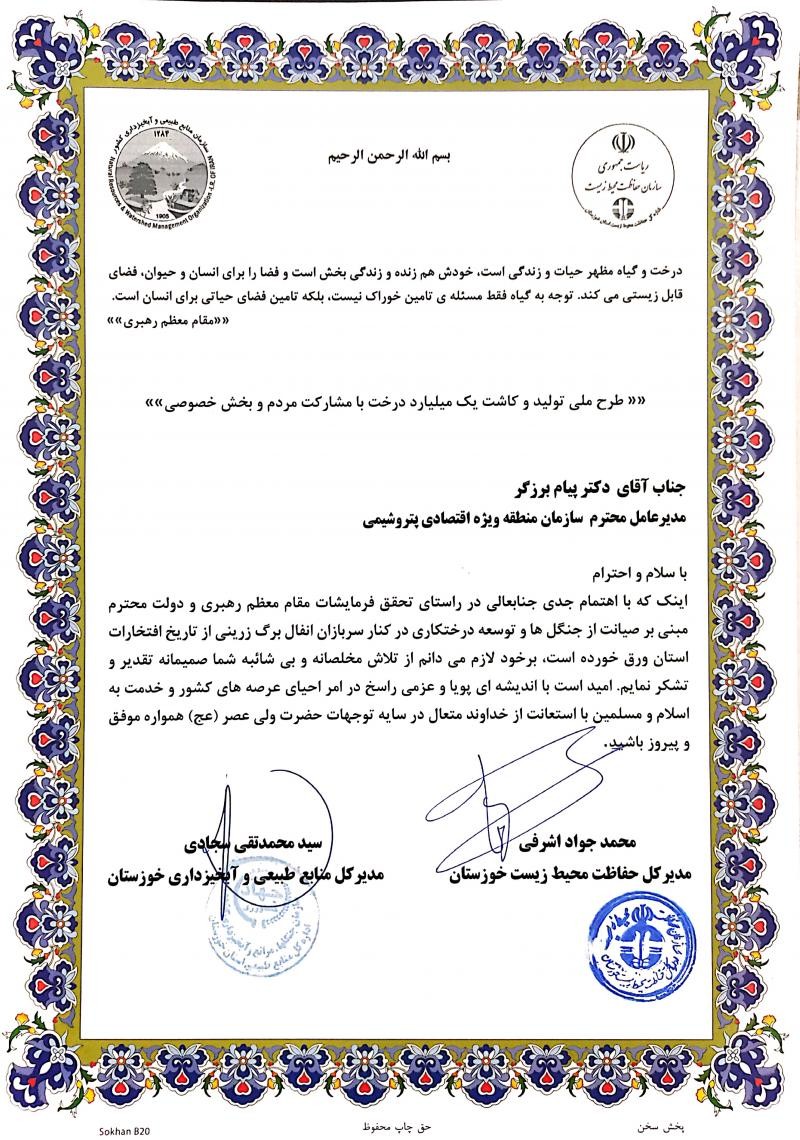 گفتنی است در هفته گذشته عملیات اجرایی کاشت ۲۰۰ هزار اصله نهال در خورهای بندر ماهشهر با حمایت شرکتهای پتروشیمی مستقر در منطقه ویژه اقتصادی پتروشیمی آغاز شد که سهم بسزایی در توسعه درختکاری و صیانت از جنگلها خواهد داشت.