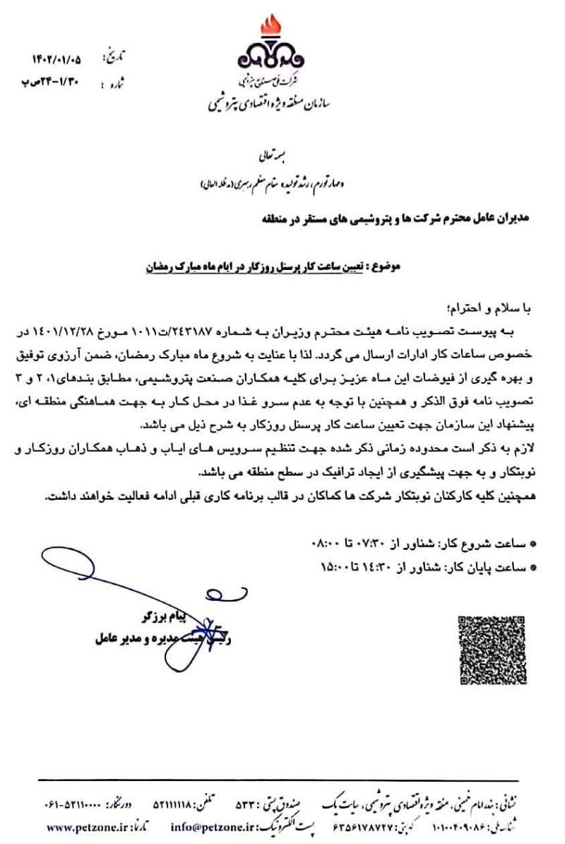 به گزارش روابط عمومی سازمان منطقه ویژه اقتصادی پتروشیمی، پیام برزگر مدیرعامل سازمان منطقه ویژه اقتصادی پتروشیمی در نامه‌ای خطاب به مدیران عامل شرکت‌ها و پتروشیمی‌های مستقر در منطقه ساعت کاری کارکنان روزکار را تعیین کرد.