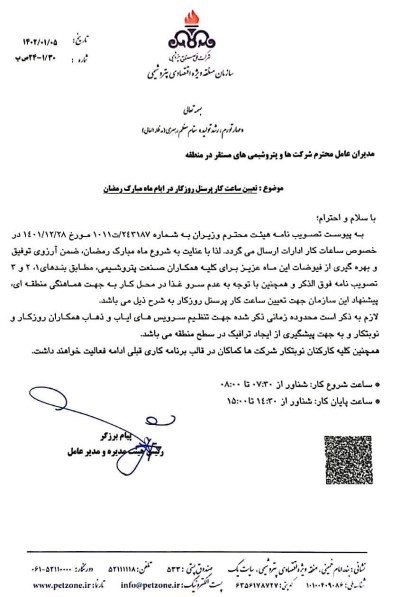به پیوست تصویب نامه هیئت محترم وزیران به شماره ۲٤۳۱۸۷ / ت ۱۰۱۱ مورخ ۱٤۰۱/۱۲/۲۸ در خصوص ساعات کار ادارات ارسال می‌گردد. لذا با عنایت به شروع ماه مبارک رمضان، ضمن آرزوی توفیق و بهره‌گیری از فیوضات این ماه عزیز برای کلیه همکاران صنعت پتروشیمی، مطابق بندهای ۱، ۲ و ۳ تصويب نامه فوق الذکر و همچنین با توجه به عدم سرو غذا در محل کار به جهت هماهنگی منطقه‌ای پیشنهاد این سازمان جهت تعیین ساعت کار پرسنل روزکار به شرح ذیل می‌باشد.