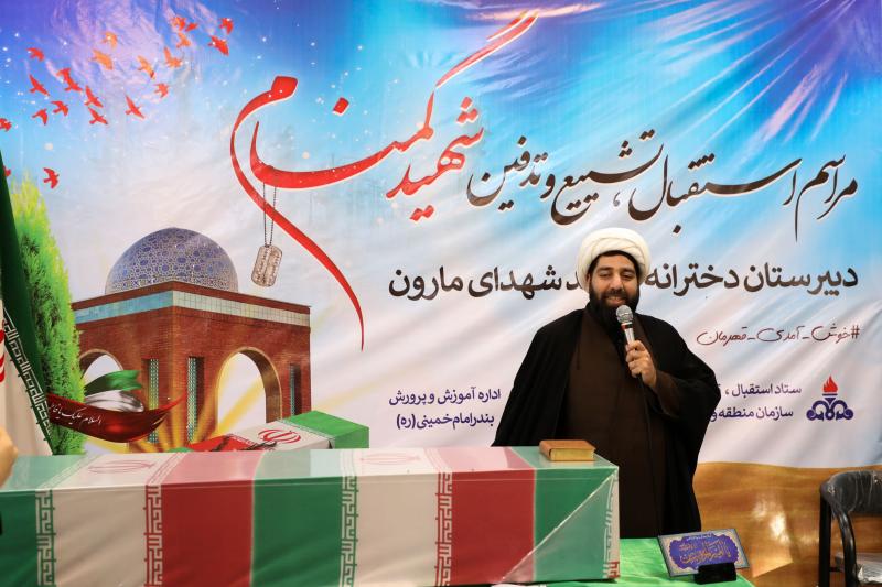 صبح امروز پیکر مطهر شهید گمنام دوران دفاع مقدس وارد مدرسه 12 کلاسه مارون بندر امام خمینی(ره) شد و مورد استقبال دانش آموزان دختر این مدرسه قرار گرفت.