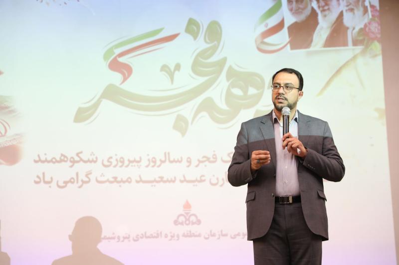 به گزارش روابط عمومی سازمان منطقه ویژه اقتصادی پتروشیمی، مدیرعامل سازمان منطقه ویژه اقتصادی پتروشیمی در جشن پیروزی انقلاب اسلامی و عید مبعث که با حضور تعداد زیادی از کارکنان این سازمان در تالار آفرینش برگزار شد، اظهار کرد: راهبرد نیروی انسانی در سازمان منطقه ویژه اقتصادی پتروشیمی مبتنی بر نگاه برادرانه، نوآورانه، مجاهدانه و خدمت بی شائبه به مردم و ذینفعان است و در این نوع نگاه فرقی بین مدیرعامل و کارگر نباید وجود داشته باشد و همه برای خدمت به مردم باید تلاش کنیم.