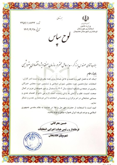 اینک که به فضل الهی و با همت و تلاش شبانه روزی همه مجریان و دست اندرکاران، انتخابات دوازدهمین دوره مجلس شورای اسلامی و ششمین دوره مجلس خبرگان رهبری در جمعه ی باشکوه اسفند سال ۱۴۰۲ با استقبال پرشور هموطنان عزیز در کمال صحت، امنیت، نظم و آرامش به پایان رسیده است، لازم میدانم از اهتمام جدی و مساعی جنابعالی در امر برگزاری و پشتیبانی انتخابات با این فرمانداری تقدیر و تشکر نمایم.