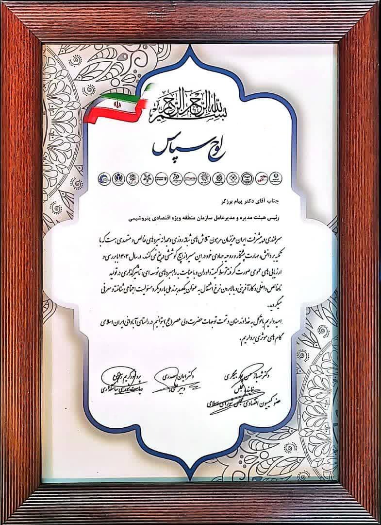 متن لوح تقدیر سازمان منطقه ویژه اقتصادی پتروشیمی که به امضای اعضای کمیسیون اقتصادی مجلس شورای اسلامی و دبیران همایش یکصد برند ملی با محوریت مسئولیت اجتماعی رسیده است به این شرح است: