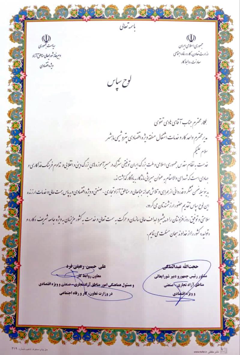 تقدیر وزارت تعاون، کار و رفاه و شورایعالی مناطق آزاد و ویژه اقتصادی از رئیس اداره کار و خدمات اشتغال منطقه ویژه اقتصادی پتروشیمی