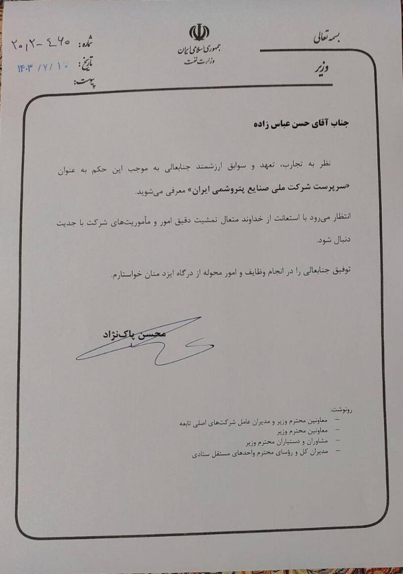 وزیر نفت طی حکمی «حسن عباسزاده» را به عنوان سرپرست شرکت ملی صنایع پتروشیمی منصوب کرد.