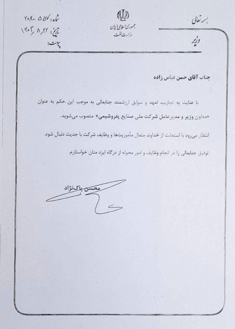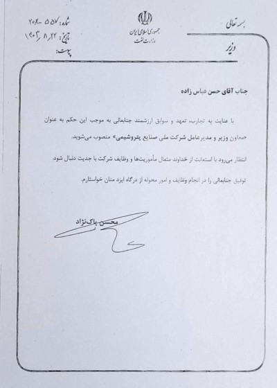 «با عنایت به تجارب، تعهد و سوابق ارزشمند جنابعالی به موجب این حکم بهعنوان «معاون وزیر و مدیرعامل شرکت ملی صنایع پتروشیمی» منصوب میشوید.