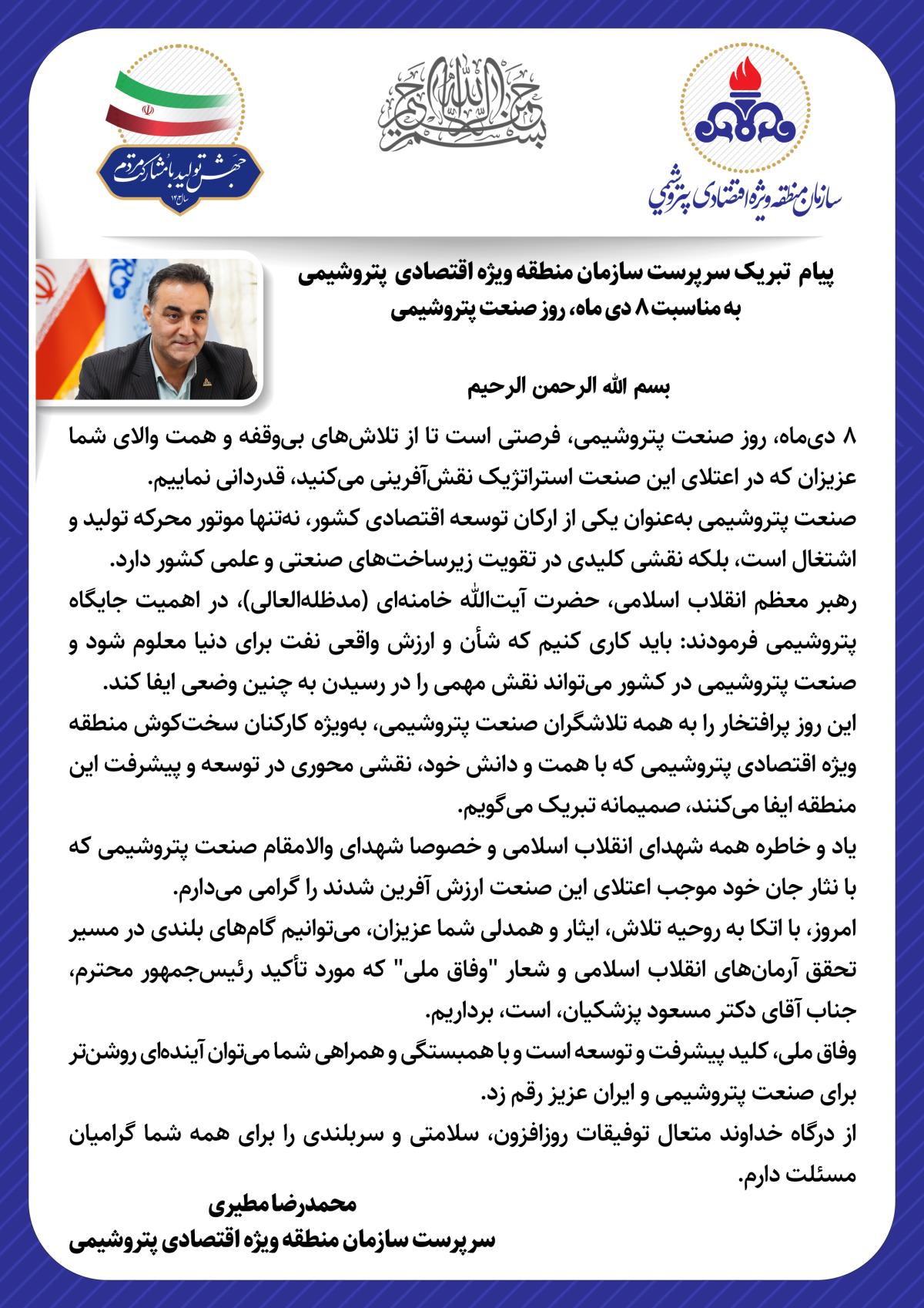 محمدرضا مطیری سرپرست سازمان منطقه ویژه اقتصادی پتروشیمی به مناسبت 8 دی ماه روز ملی صنعت پتروشیمی، با صدور پیامی این روز را تبریک گفت.