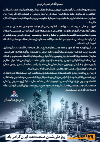 روابط عمومی سازمان منطقه ویژه اقتصادی پتروشیمی به مناسبت 29 اسفند، روز ملی صنعت نفت ایران پیامی صادر کرد.