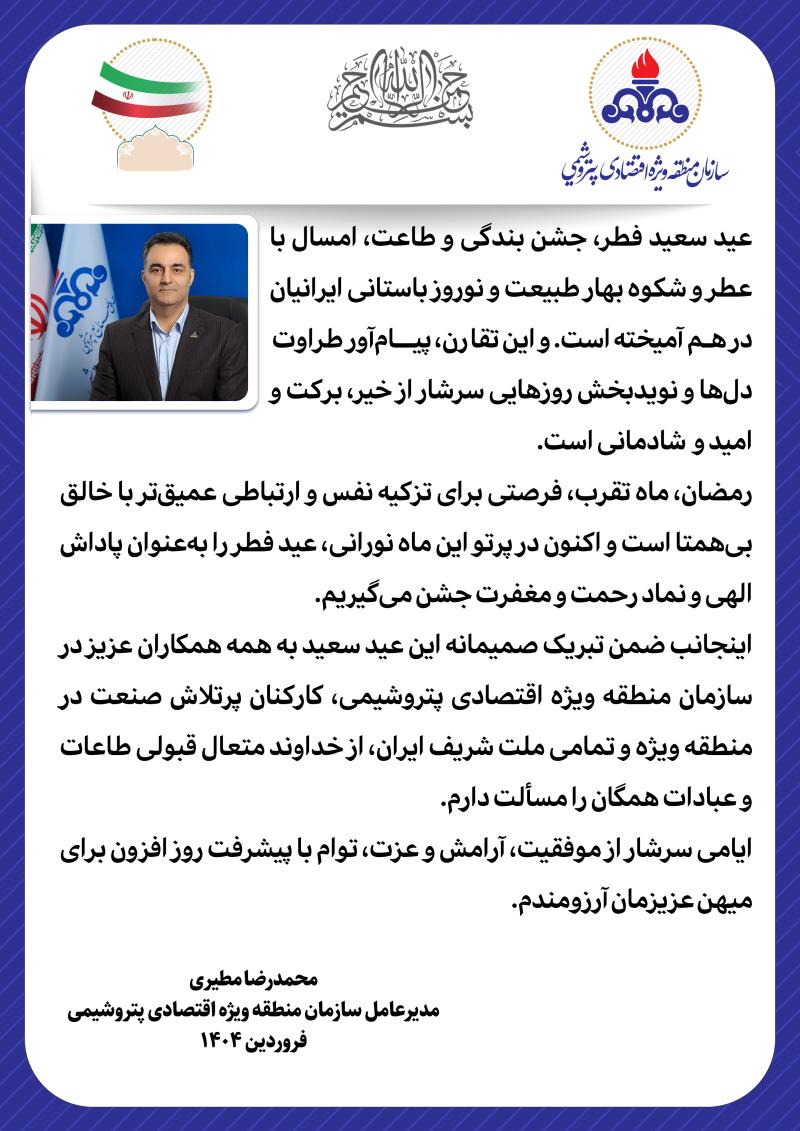 محمدرضا مطیری مدیرعامل سازمان منطقه ویژه اقتصادی پتروشیمی با صدور پیامی فرا رسیدن عید سعید فطر را تبریک گفت.