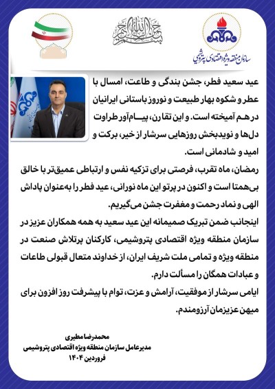 اینجانب ضمن تبریک صمیمانه این عید فرخنده به همه همکاران عزیز در سازمان منطقه ویژه اقتصادی پتروشیمی، کارکنان پرتلاش صنعت در منطقه ویژه و تمامی ملت شریف ایران، از خداوند متعال قبولی طاعات و عبادات همگان را مسألت دارم.